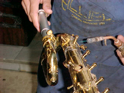 El saxo esta listo para tocar, aquí podemos ver el curvo reconstruido.